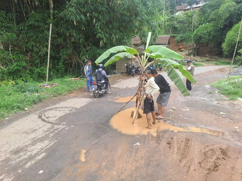 SUMEDANG, Poskotanews.co.id – Kecewa Gara-Gara Tidak Digubris Pemerintah, Aksi Tanam Pohon Pisang di Jalan dilakukan Warga Masyarakat Dusun Pasirhurip, RT 001 RW 005, Desa Sukajadi, Kecamatan Wado, Kabupaten Sumedang, Rabu (04/12/2024),