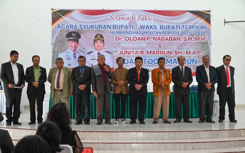 Doa acara syukuran atas dilantiknya Bupati dan Wakil Bupati Humbahas periode 2025-2030, diawali kebaktian dengan pengkotbah Praeses HKBP Distrik III Humbang Pdt Robinsarhot Lumban Gaol S.Th MM. Siraman rohani yang disampaikan tertulis dalam Filipi 2:1-4 dengan topik “Nasihat supaya bersatu dan merendahkan diri seperti Kristus”. Ayat 1. Jadi karena dalam Kristus ada nasihat, ada penghiburan kasih, ada persekutuan roh, ada kasih mesra dan belas kasihan. 2. Karena itu sempurnakanlah sukacitaku dengan ini: hendaklah kamu sehati sepikir, dalam satu kasih, satu jiwa, satu tujuan. 3. Dengan tidak mencari kepentingan sendiri atau puji-pujian yang sia-sia. Sebaliknya hendaklah dengan rendah hati yang seorang menganggap yang lain lebih utama dari pada dirinya sendiri. 4. Dan janganlah tiap-tiap orang hanya memperhatikan kepentingannya sendiri, tetapi kepentingan orang lain juga.