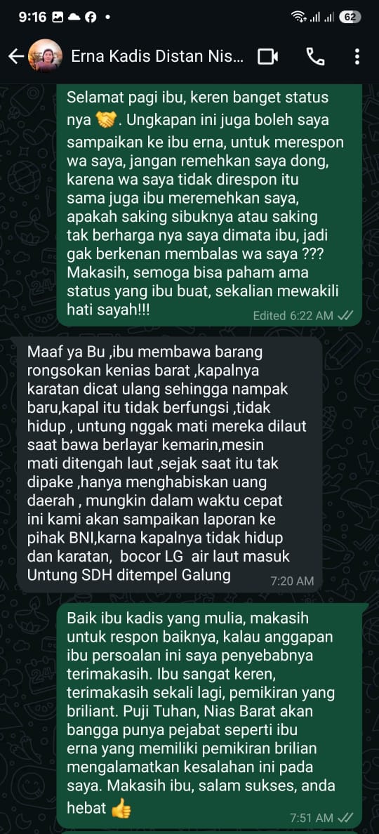 Kepala Dinas Ketahanan Pangan, Pertanian, dan Perikanan Kabupaten Nias Barat, Ernawati Gulo, menjadi sorotan setelah tanggapannya melalui WhatsApp kepada Tenaga Ahli Bupati, Nelly Marinda Situmorang, memicu kontroversi. Dalam pesan tersebut, Ernawati menuding kapal bantuan dari BNI yang dibawa Nelly ke Nias Barat sebagai kapal rongsokan yang hanya dicat ulang dan dianggap tidak layak pakai.