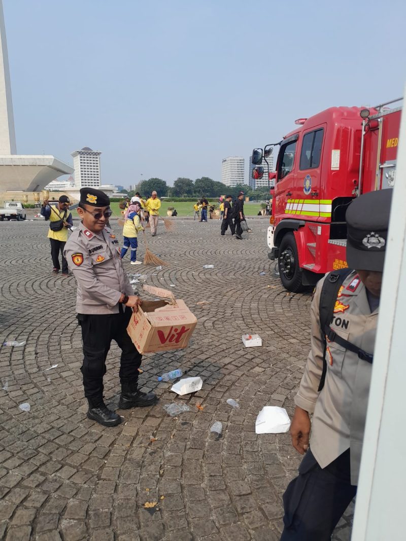 JAKARTA, Poskotanews.co.id – Anggota kepolisian membantu petugas kebersihan untuk membersihkan sisa-sisa sampah di kawasan Silang Monas usai pelaksanaan May Day Fiesta, Kamis (01/05/2025).