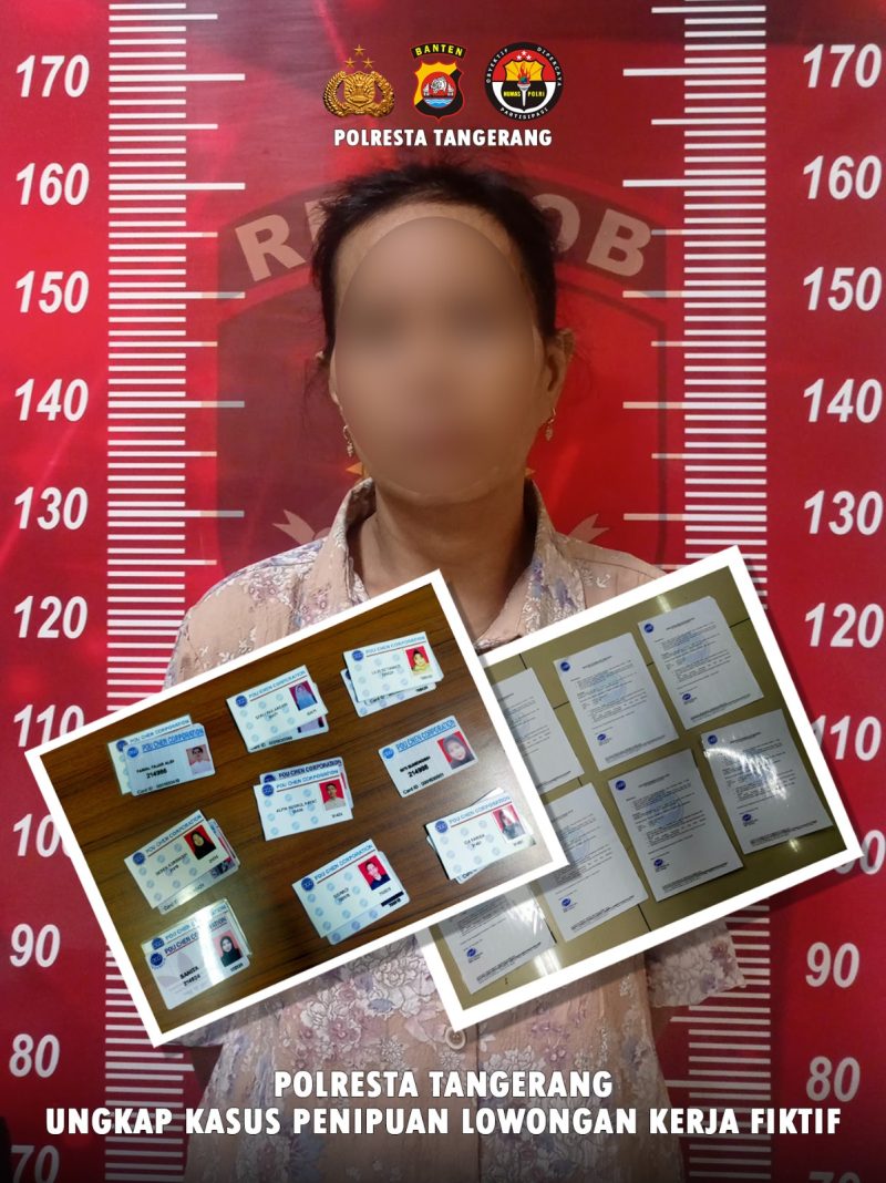 Kapolresta Tangerang Kombes Pol Baktiar Joko Mujiono, S.I.K., M.M., melalui Kasat Reskrim Kompol Arief N. Yusuf, (06/05/2025). menjelaskan bahwa dua orang perempuan berinisial A (43 Th) dan L (saat ini ditahan dalam perkara lain), menjadi tersangka utama. Keduanya menjanjikan pekerjaan di salah satu perusahaan ternama di Serang, dengan mengaku sebagai orang kepercayaan pemilik perusahaan tersebut.Modus operandi yang digunakan pelaku yakni menawarkan pekerjaan melalui media sosial Facebook dan meminta bayaran sebesar Rp23 juta hingga Rp27 juta per orang. Korban yang tergiur kemudian membawa sembilan orang pelamar kerja, menyerahkan dokumen serta uang tunai dan transfer ke rekening atas nama pihak ketiga. Namun, surat panggilan kerja dan kartu pegawai yang diterima ternyata palsu.“Tersangka A berhasil diamankan di wilayah Cikupa dan langsung dibawa ke Polresta Tangerang untuk dilakukan pemeriksaan lebih lanjut,” ujar Kompol Arief.
