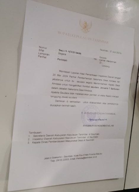 TANIMBAR MALUKU, Poskotanews.co.idKepala Desa (Kades) Amdasa berisinial BB diduga abaikan perintah Pj Bupati Kabupaten Kepulauan Tanimbar soal pengaktifan sekretaris desanya JTS kembali yang sebelumnya diberhentikan secara sepihak.