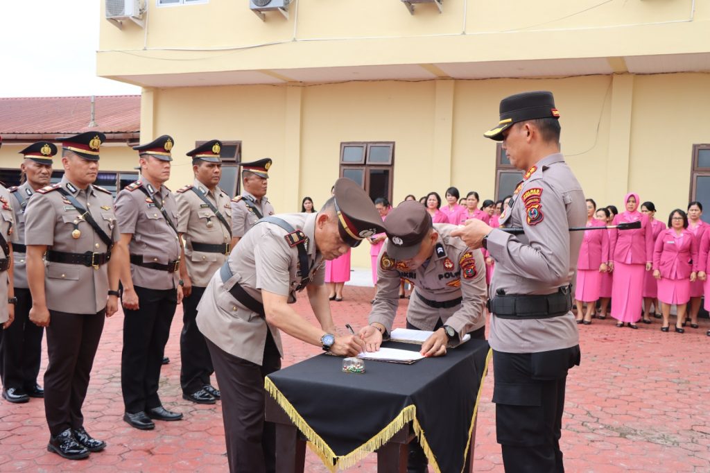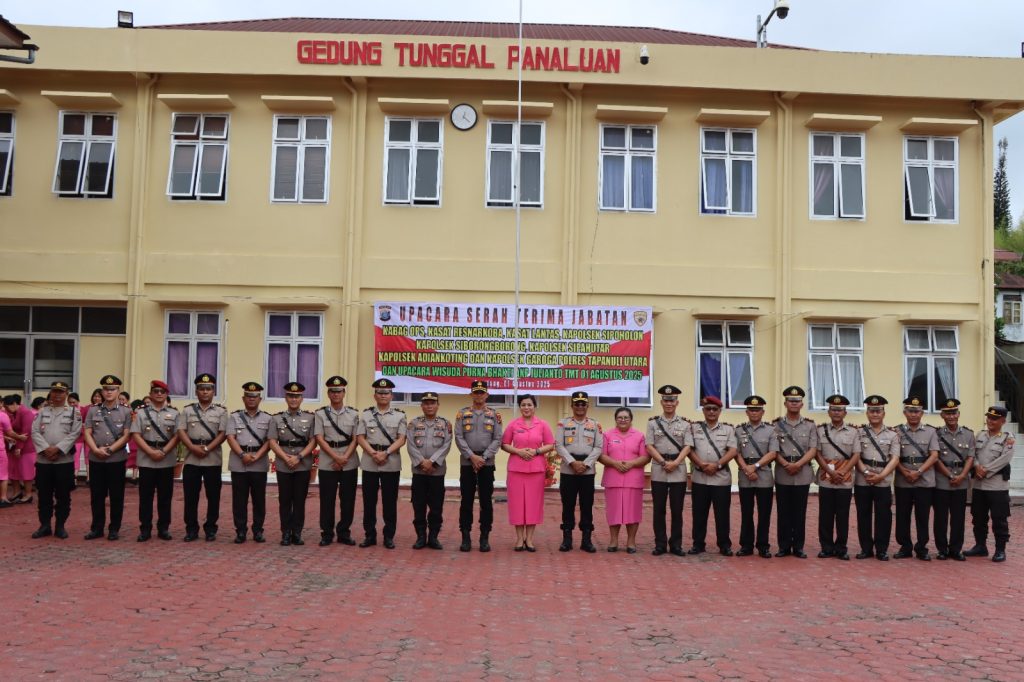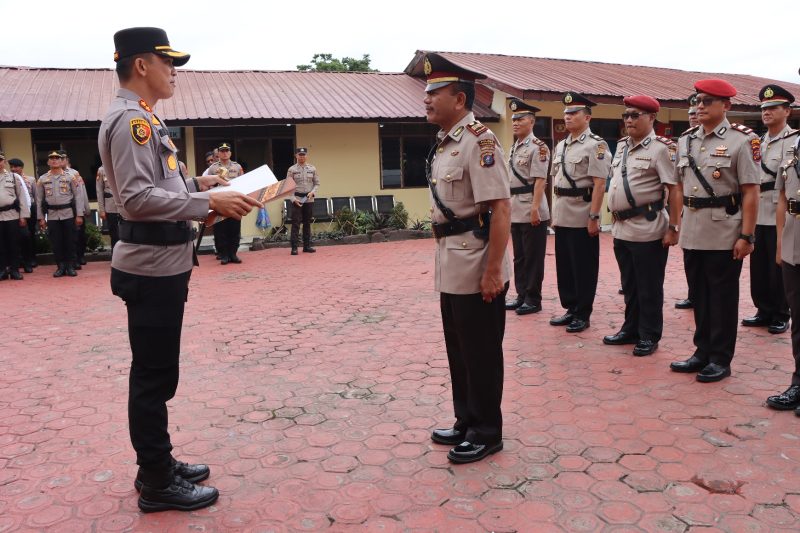 TAPUT SUMUT, Poskotanews.co.id- Kepala kepolisian resort Tapanuli Utara AKBP Ernis Sitinjak, SH, S.I.K, pimpin serah terima jabatan 8 perwira Polres Taput, Jumat (01/08/2025).