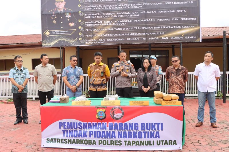 TAPUT SUMUT, Poskotanews.co.id- Polres Tapanuli Utara melaksanakan pemusnahan barang bukti ganja kering seberat 8.506,81 gram atau 8,5 Kg hasil penangkapan satuan reserse narkoba selama bulan agustus 2025.