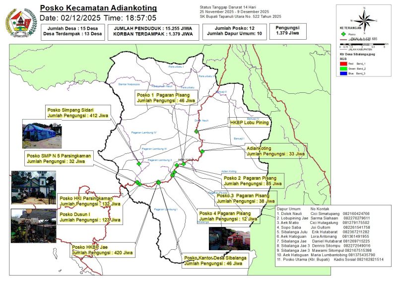 Di Kecamatan Adiankoting, dua desa menjadi pusat lokasi pengungsian, yaitu Desa Sibalanga dan Lobu Pining. Sementara itu, lima desa lainnya masih belum dapat diakses karena tertutup longsor dan kondisi medan ekstrem, yakni Siantar Naipospos, Pardomuan Nauli, Pagaran Lambung II, Pagar Lambung IV, dan Pagar Lambung III. Untuk sementara waktu, bantuan bagi wilayah-wilayah tersebut disalurkan melalui jalur udara. Adapun dua desa yang sebelumnya terisolir Banuaij I dan Banuaij IV kini sudah bisa diakses oleh tim darat, termasuk Pagar Lambung I yang juga telah berhasil ditembus.