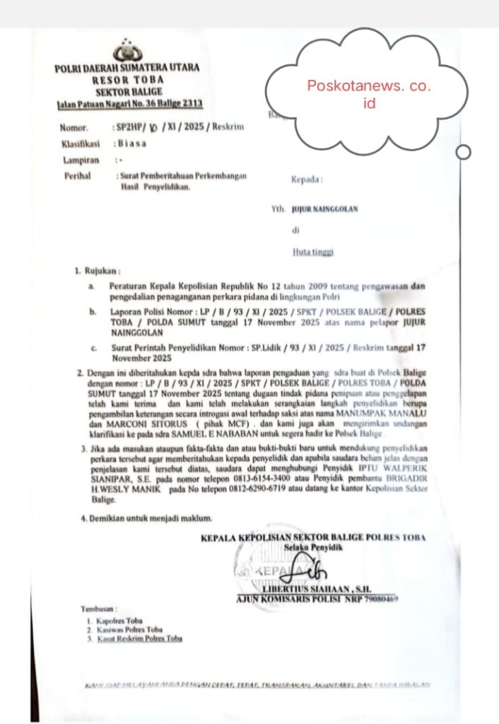 BALIGE SUMUT, Poskotanews.co.id– Jujur Nainggolan warga Hutatinggi, Kecamatan Parmonangan Kabupaten Tapanuli Utara berharap agar laporan dugaan tindak pidana penipuan atau penggelapan yang telah dilaporkannya ke Polsek Balige, Polres Toba segera ditindaklanjuti secara serius dan profesional.