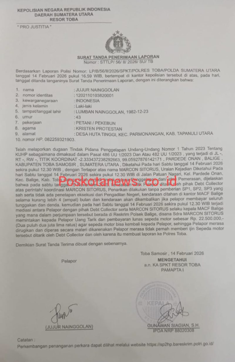 Korban (Jujur) resmi melaporkan dugaan tindak pidana penggelapan dan atau pemerasan ke Polres Toba. Laporan tersebut telah diterima dan tercatat dalam: STTLP Nomor: STTLP/56/II/2026/SU/TB. LP Nomor: LP/B/56/II/2026/SPKT/POLRES TOBA/POLDA SUMATERA UTARA pada sabtu, 14/02/2026.